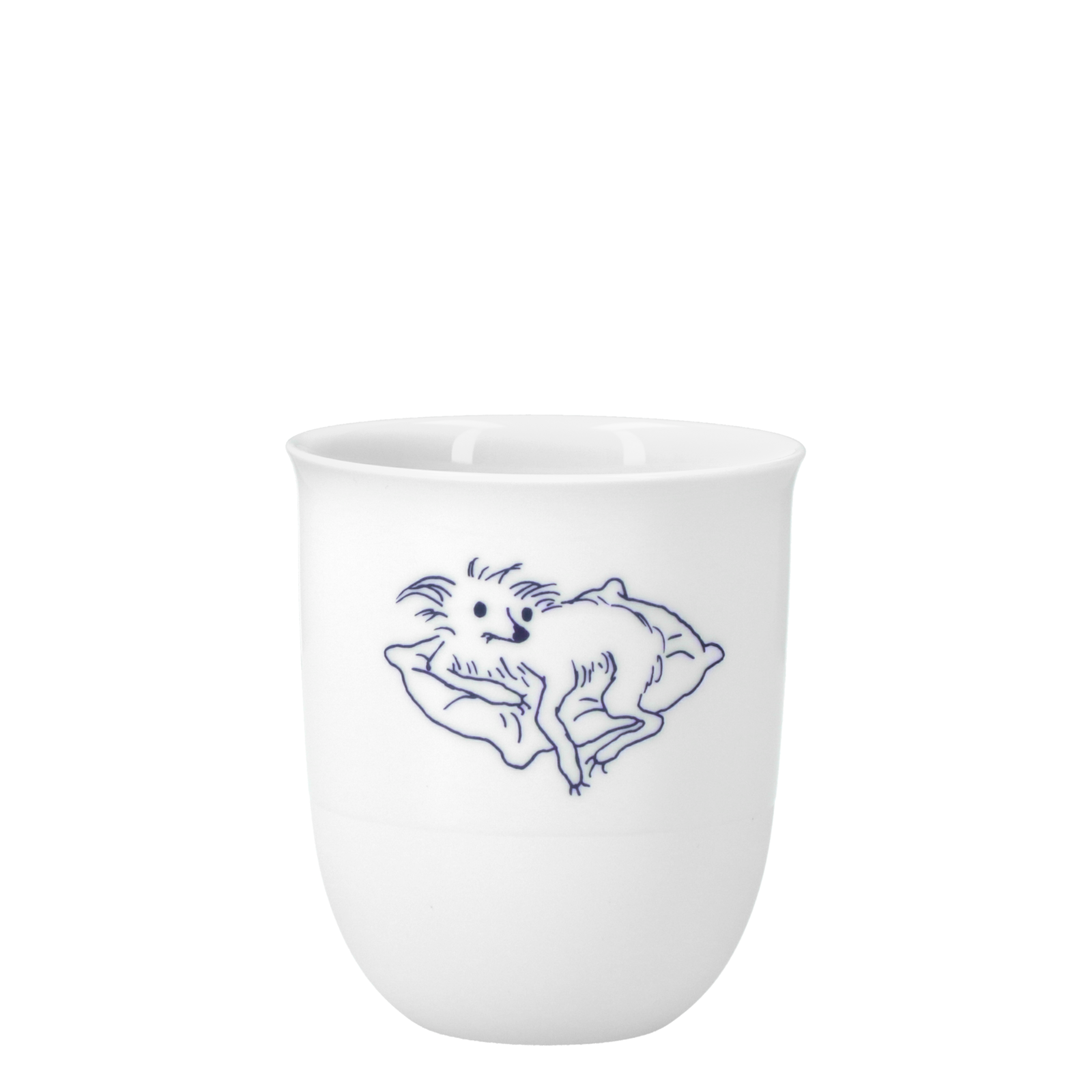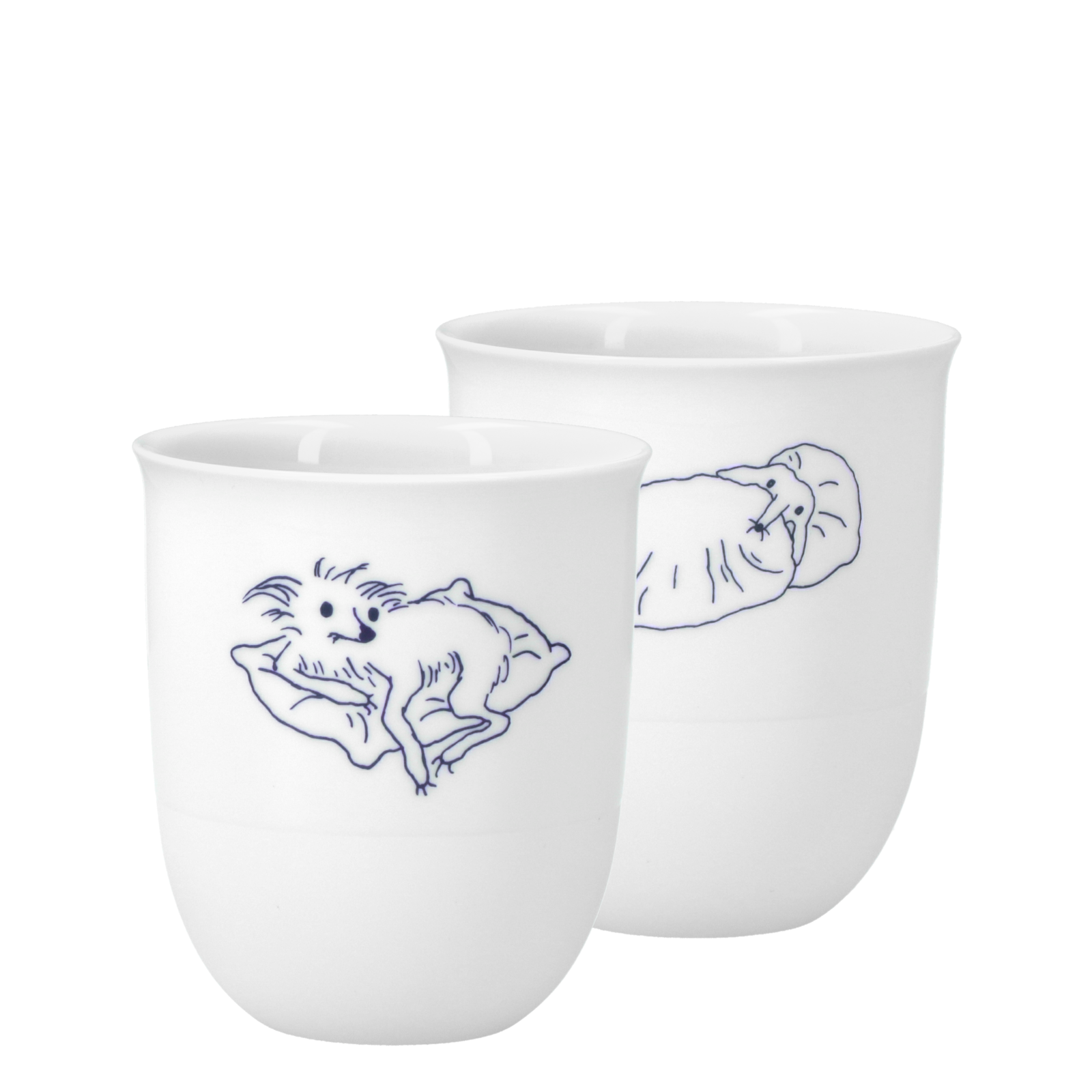 Anna Haifisch transportiert die exzentrische Brieffreundschaft und die innige Geschwisterliebe gewohnt humorvoll auf die LAB Becher No. 1. Biche und Folichon kuscheln sich – ganz die verhätschelten, royalen Lieblinge – in gezeichneter blauer Linie unter weiche Decken und auf fluffige Kissen vor weißem Grund.