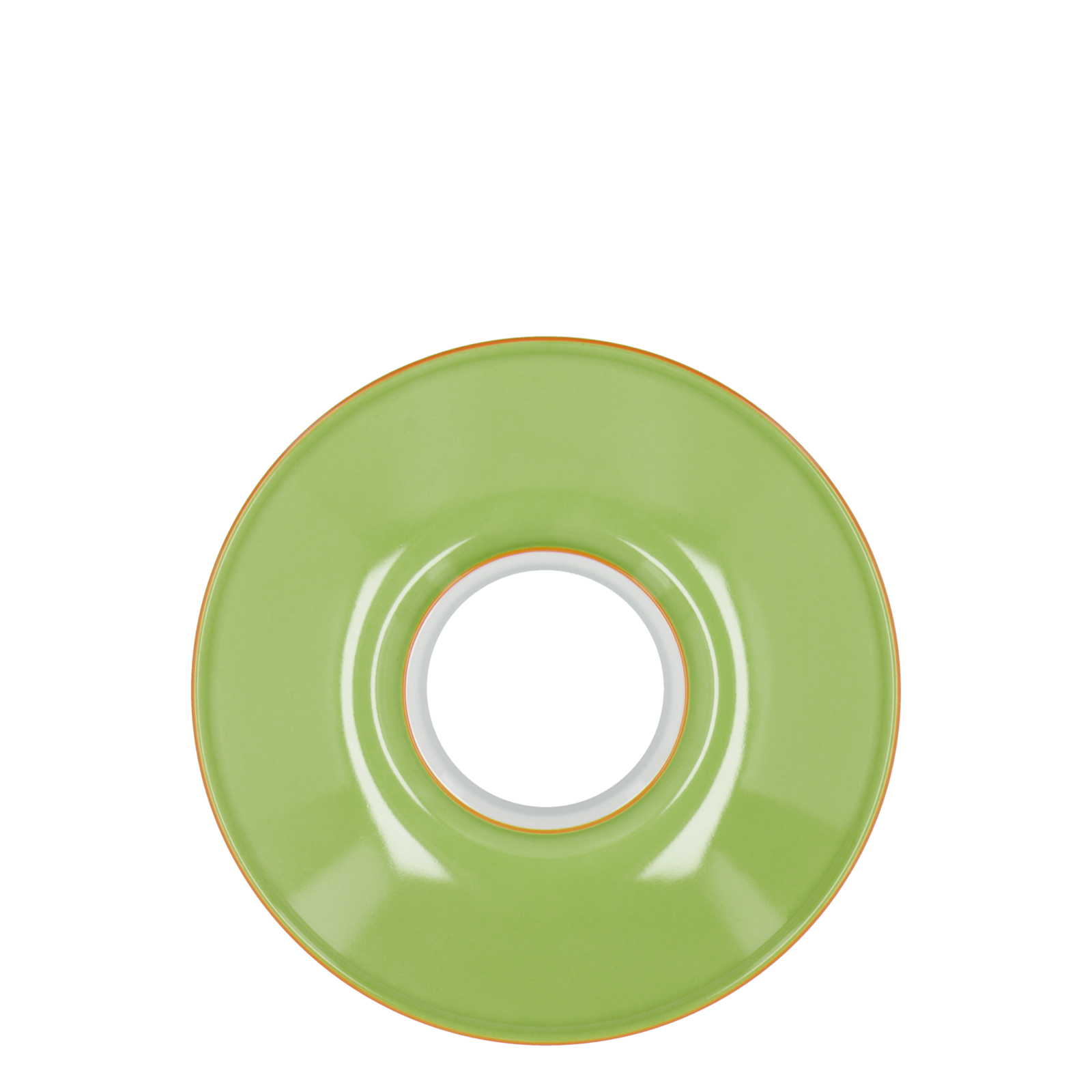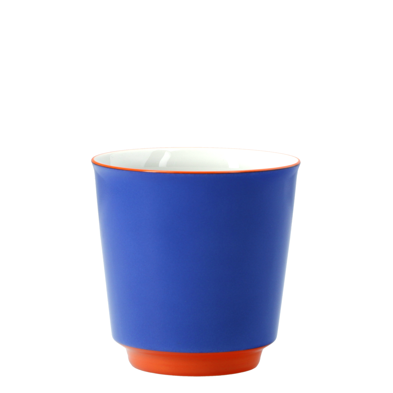 Der Designer Gisbert Pöppler taucht die Flugzeugtasse von Marguerite Friedlaender-Wildenhain in die vier leuchtenden Töne Jaune, Rouge, Bleu und Vert, die mit Rändern in leuchtendem Orange kontrastiert wird. Die Meistermalerinnen und Meistermaler der KPM Berlin übertragen die satten Töne in einem aufwendigen Verfahren per Hand auf die Kaffeetasse.