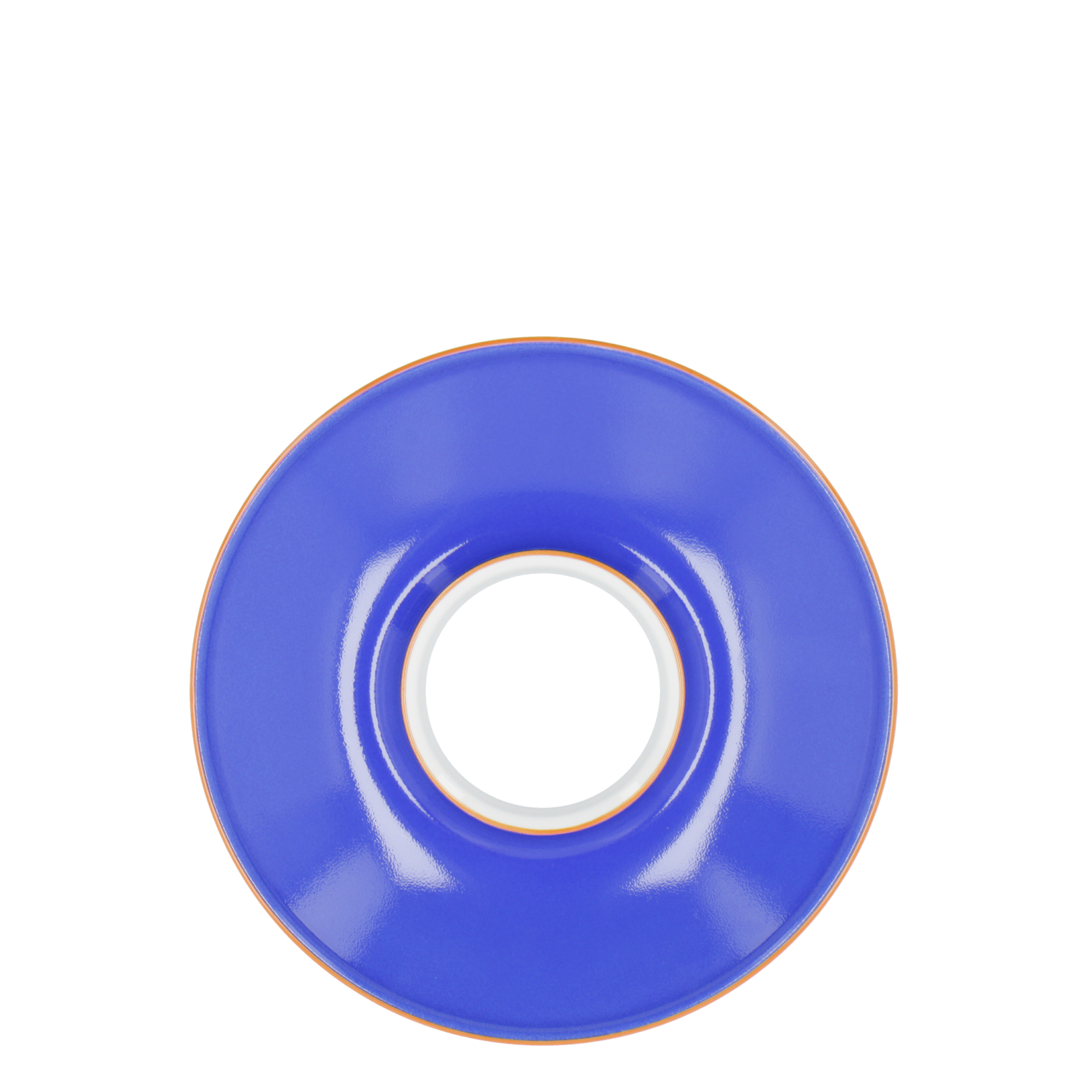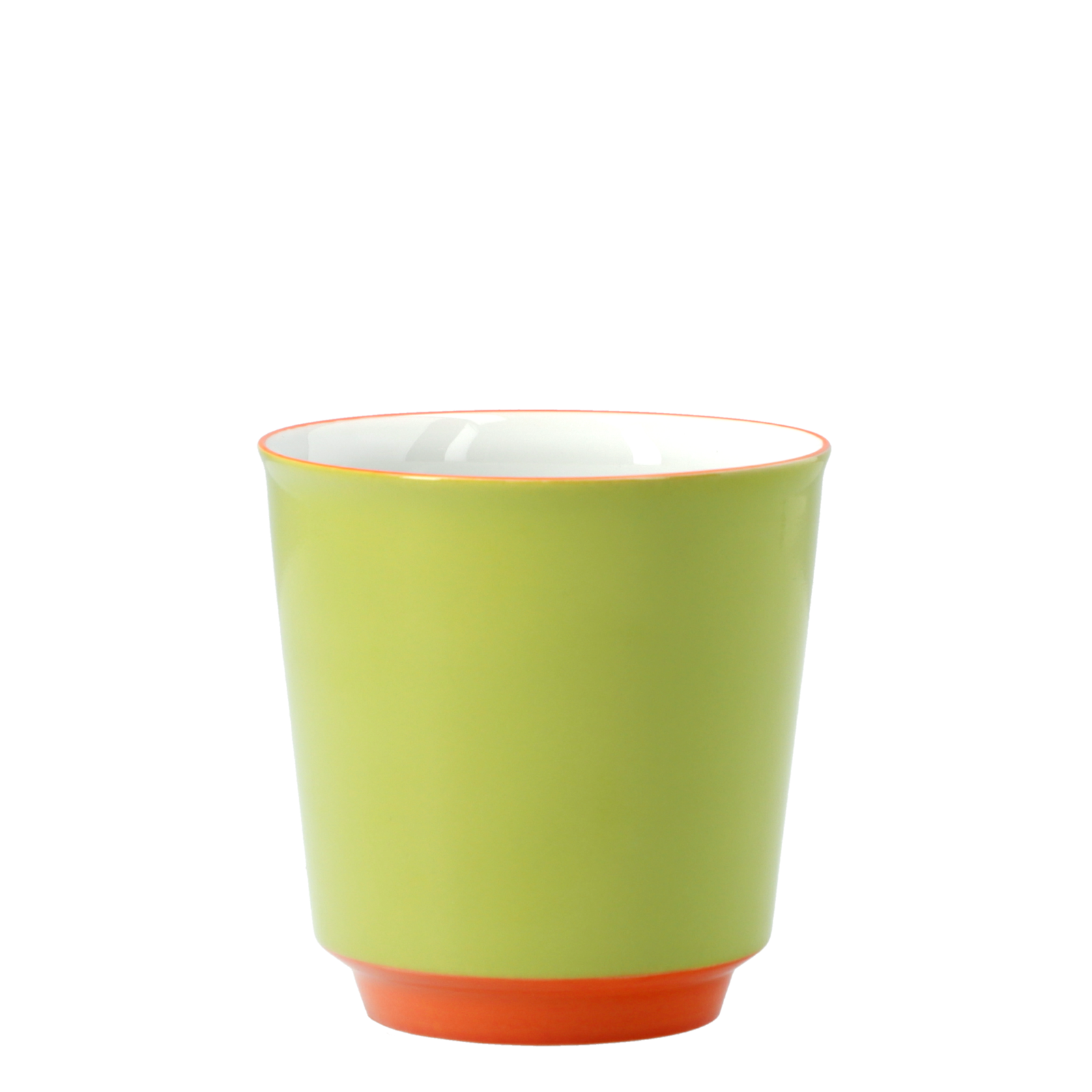 Der Designer Gisbert Pöppler taucht die Flugzeugtasse von Marguerite Friedlaender-Wildenhain in die vier leuchtenden Töne Jaune, Rouge, Bleu und Vert, die mit Rändern in leuchtendem Orange kontrastiert wird. Die Meistermalerinnen und Meistermaler der KPM Berlin übertragen die satten Töne in einem aufwendigen Verfahren per Hand auf die Kaffeetasse.