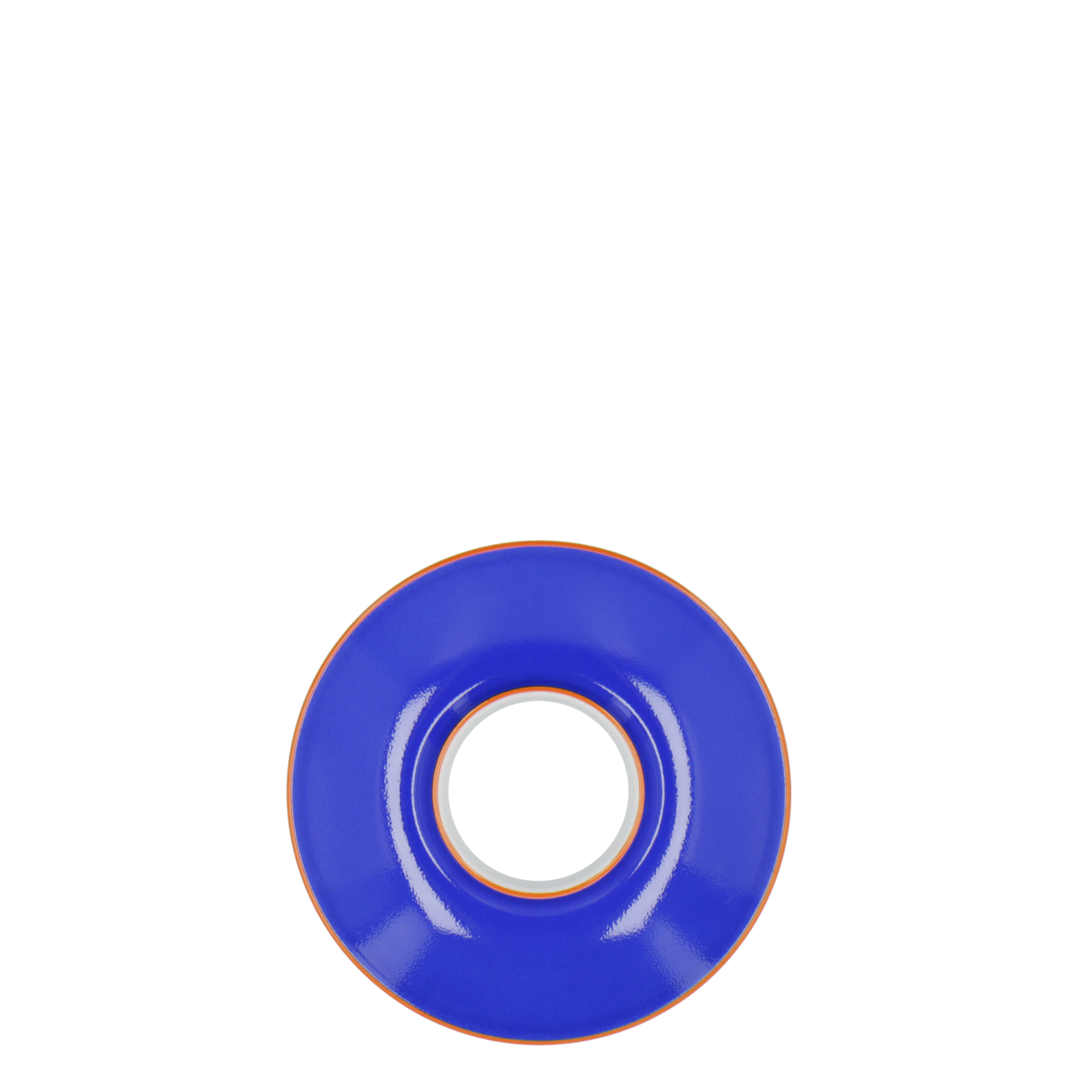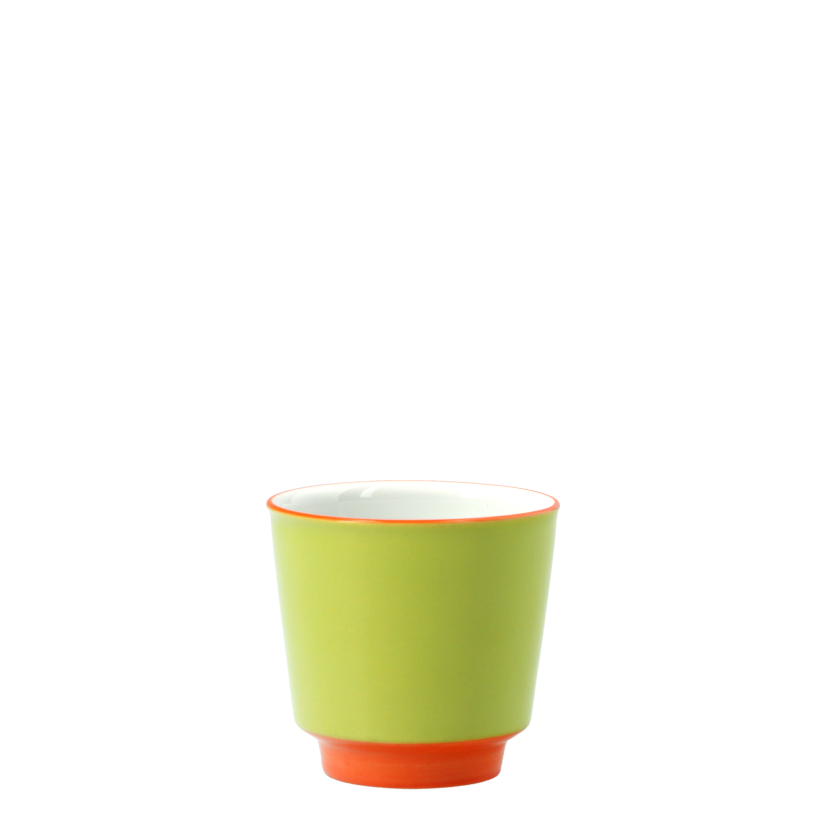 Der Designer Gisbert Pöppler taucht die Flugzeugtasse von Marguerite Friedlaender-Wildenhain in die vier leuchtenden Töne Jaune, Rouge, Bleu und Vert, die mit Rändern in leuchtendem Orange kontrastiert wird. Die Meistermalerinnen und Meistermaler der KPM Berlin übertragen die satten Töne in einem aufwendigen Verfahren per Hand auf die Espressotasse.