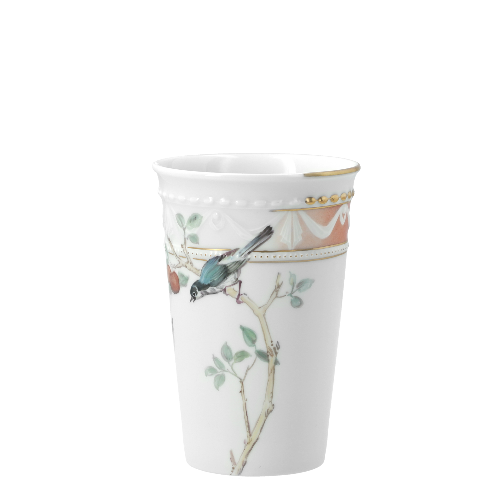 Mit der Heritage Edition Luise lanciert die KPM Berlin anlässlich des 250. Geburtstags Königin Luises von Preußen fünf in den Manufakturen am Tiergarten handgefertigte Produkte. Auf dem KURLAND To-Go-Becher, den Cadre-Vasen 0, 1 und 2 sowie der Vide Poche entfalten sich Tapetenmotive mit Verweis auf das späte 18. Jahrhundert. Inspiriert von Luises Lieblingsort Schloss Paretz übertrug die KPM-Meistermalerei exotische Blütenbäume, Vögel und Beeren mit feinem Pinselstrich auf Porzellan und verleiht der Edition Luise eine außergewöhnliche malerische Tiefe. In limitierter Auflage von 100 Stück, einzeln nummeriert, wird aus dem To-go Becher ein echtes Sammlerstück.