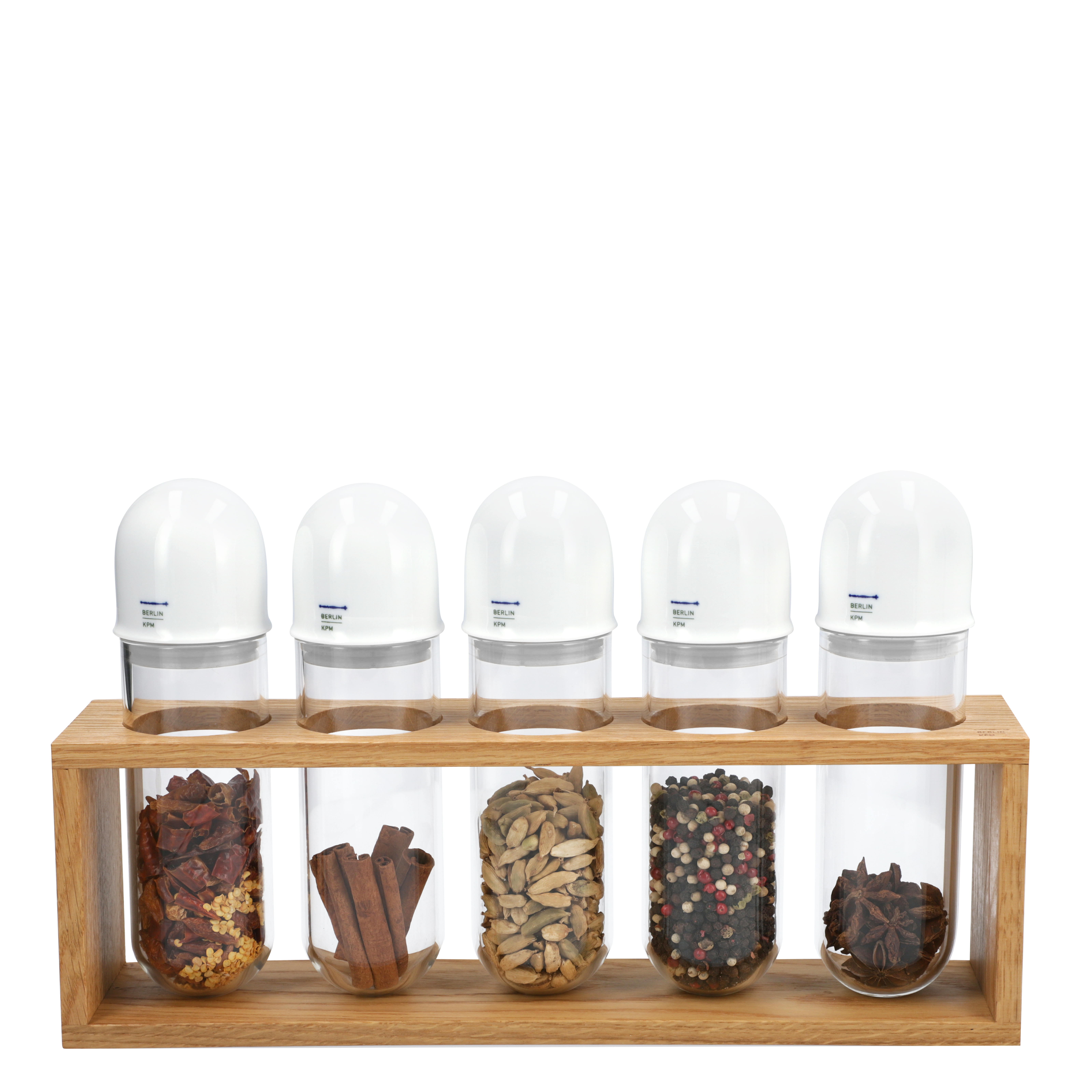 Bestehend aus Präsenter (Echtholz), 5x LAB Gewürzbehälter aus Porzellan, 5x Kunststoffstopfen, 5x Glasbehälter für Gewürzbehälter