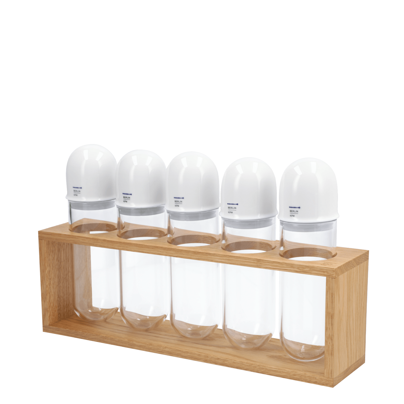 Das Gewürzregal aus hochwertigem Echtholz organisiert fünf Gewürzbehälter, deren Materialkontrast aus feinem Glas und robustem, glatt-glasiertem Porzellan Gewürze und Kräuter in Szene setzt. Luftdicht verschlossen von einem Kunststoffstopfen, fungiert das Gewürzregal in der Experimentier-Küche als funktionaler, kulinarischer Helfer und puristisches Centerpiece.