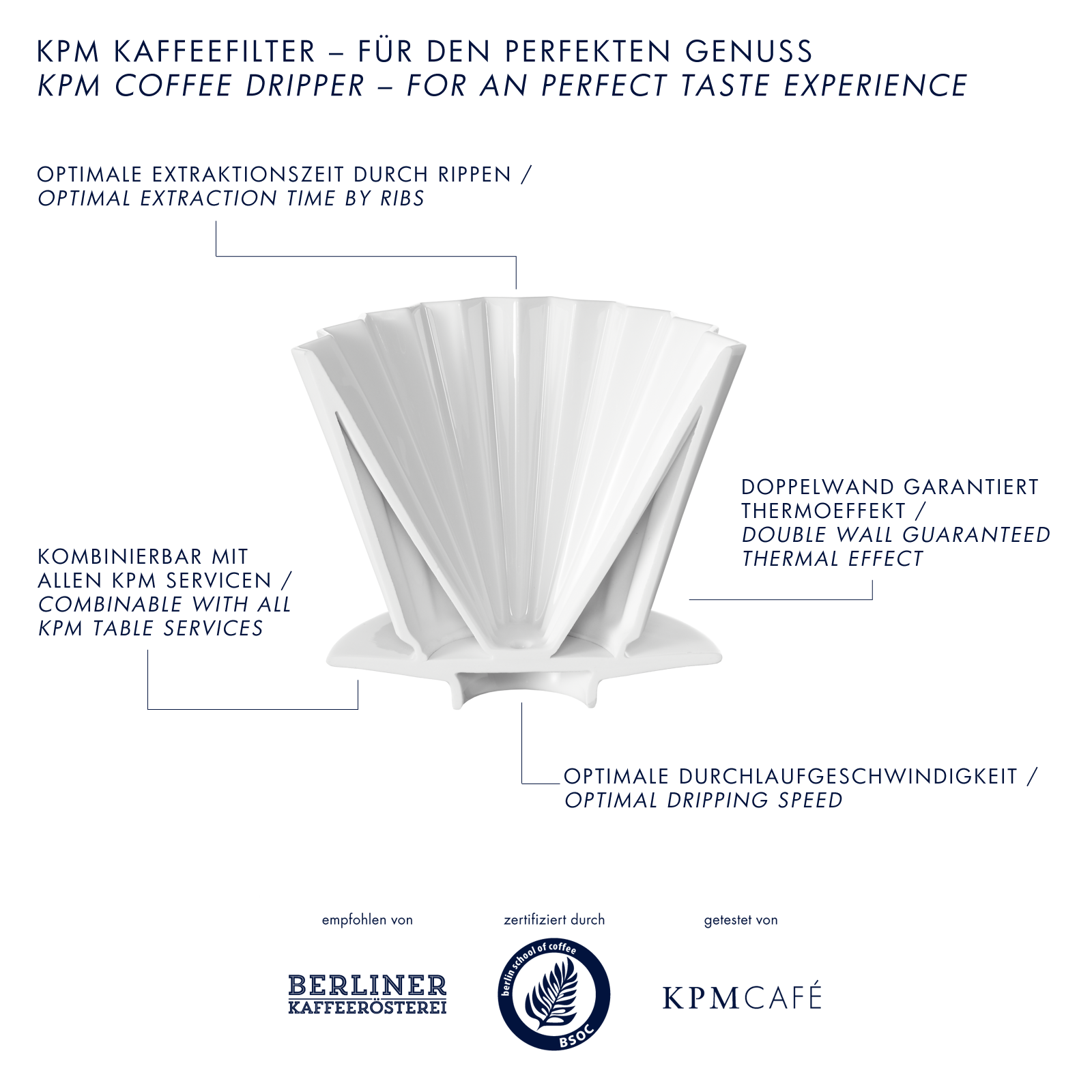 Neben der klaren Formsprache überzeugt der doppelwandige Kaffeefilter nicht nur als außerordentliches Designerlebnis, sondern ebenfalls aufgrund seiner durchdachten Funktionalität. Die doppelte Wand des Filters bewirkt einen anhaltenden Thermoeffekt, der das Wasser während der Filterung auf einer idealen Temperatur hält. Dabei erwärmt sich die äußere Wand kaum und kann jederzeit mit bloßen Händen berührt werden. Durch die Rippen wird zudem e